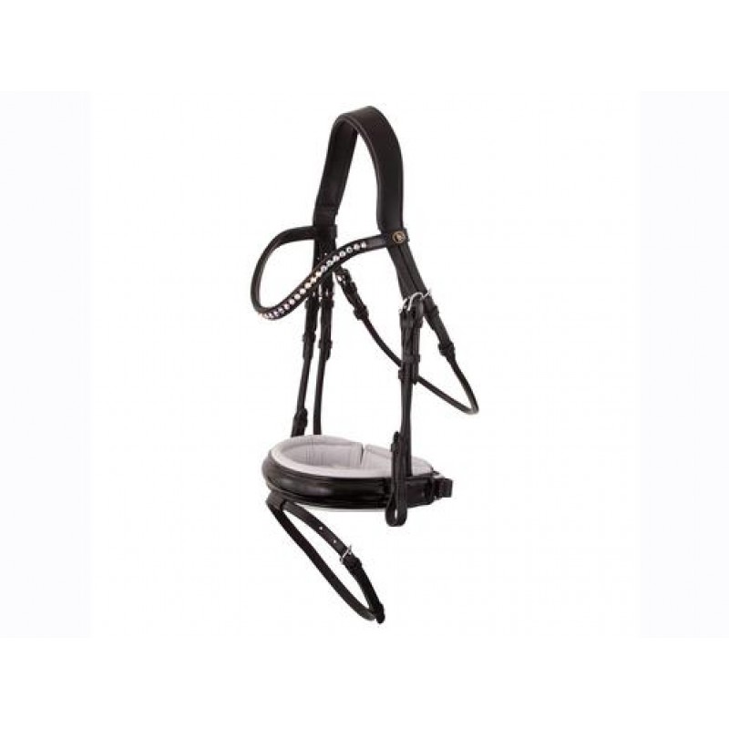 Συμμετρική κεφαλαριά με μία ανατομικά διαμορφωμένη κορυφαία με μαλακή επένδυση. Το καμπύλο λουρί με λουστρίνι έχει εμπλουτιστεί με SWAROVSKI ELEMENTS και έχει μαλακή επένδυση. Το εξαιρετικά πλατύ noseband (± 4,5 cm) που φέρει λάστιχο με δέρμα λουστρίνι είναι στρογγυλά ανυψωμένο, με μαλακή επένδυση και έχει φαρδύ μαξιλάρι για το πηγούνι επίσησ με μαλακή επένδυση. Η κεφαλαριά έχει ένα προσάρτημα σχήματος V και κουμπώματα για τη στομίδα, με άγκιστρα. Το noseband , το περιλαίμιο και το λουρί στα μάγουλα είναι κατασκευασμένα από στρογγυλό ραμμένο δέρμα. Επίσης διαθέτει στρογγυλά, γυαλιστερά εξαρτήματα ασημί χρώματος. Παρέχεται χωρίς τα ηνία.