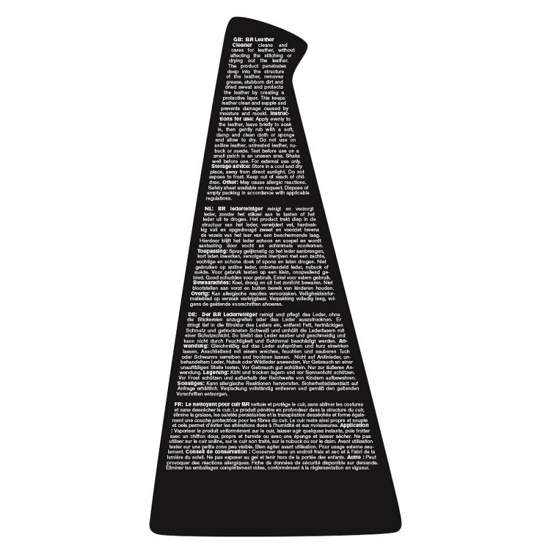 Εφαρμόστε ομοιόμορφα στο δέρμα, αφήστε το να απορροφηθεί για λίγο και στη συνέχεια τρίψτε απαλά με ένα μαλακό, νωπό και καθαρό πανί ή σφουγγάρι. Αφήστε να στεγνώσει. Ανάλογα με τον βαθμό ρύπανσης, ξεπλύνετε το πανί ή το σφουγγάρι μερικές φορές. Για βέλτιστα αποτελέσματα, επεξεργαστείτε το δέρμα στη συνέχεια με το BR Μαλακτικό Δέρματος, κωδικός (BR763002).
